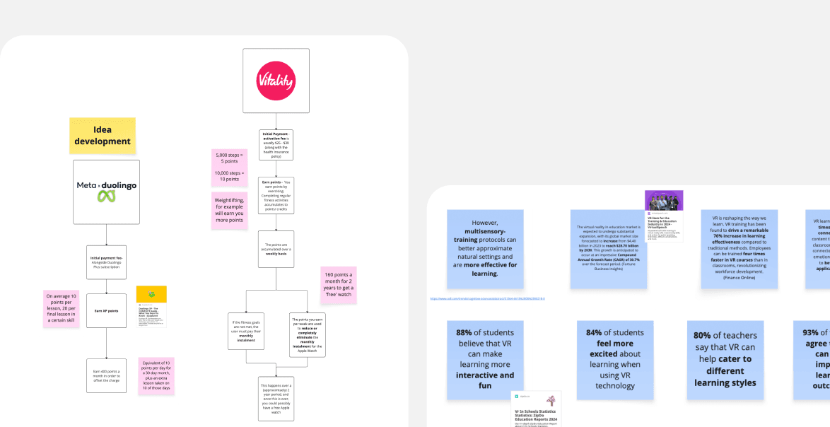 I took inspiration from platforms like Vitality, where users can earn rewards through consistent activity. This led to a points-based model where users could reduce—or even eliminate—the cost of the VR headset over time, simply by keeping up with their language learning in VR.