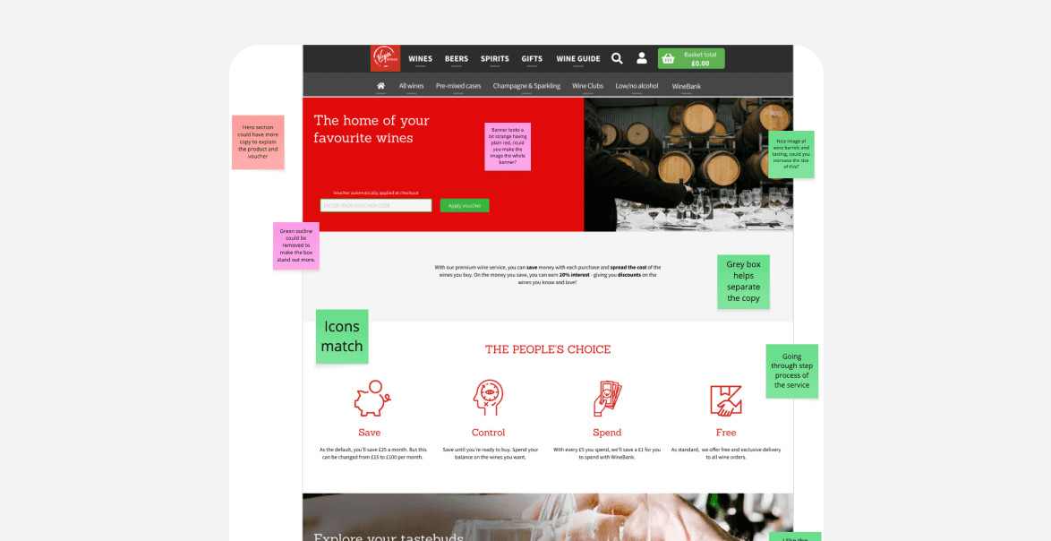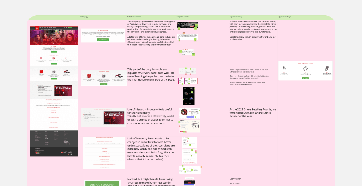 We conducted thorough competitor analysis, from both indirect and direct competitors. Their strengths and weaknesses were assed, which allowed us to identify opportunities for improvement. User flow breakdowns, along with markups helped us refine the user journey for Virgin Wines - research which was used to optimise conversion rates.